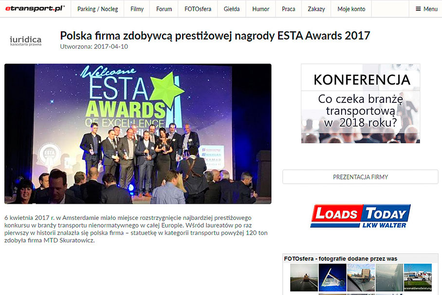 Miło nam poinformować, że w roku 2017 nagrodę ESTA Award przyznano firmie MTD.